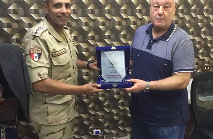 قام محمد عبد الهادى القطب رئيس مجلس إدارة المعاهد القومية باهداء درع المعاهد للسيد العميد/ محمد عبد الهادى ابراهيم المستشار العسكرى لمحافظة بورسعيد