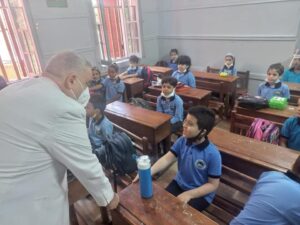 وقد تفقد سيادته المدرسة والتأكد من اتباع الاجراءات الاحترازية لفيروس كرونا كما قام بالمرور على فصول المدرسة لتفقد العملية التعليمية